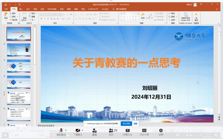 交流会通过线上方式召开,烟台大学刘绍丽副教授以“关于青教赛的一点思考”为题,结合自己丰富的教学经验和多次指导青年教师参加教学比赛的实践,深入浅出地剖析了青年教师教学比赛的重要意义、参赛准备策略以及比赛中常见的误区与应对策略。她强调,青年教师教学比赛不仅是展示个人教学风采的平台,更是促进青年教师快速成长、提升教学质量的重要途径。刘老师通过生动的案例和具体的操作建议,为参会青年教师指明了参赛的方向,激发了他们参与教学比赛的积极性和热情。