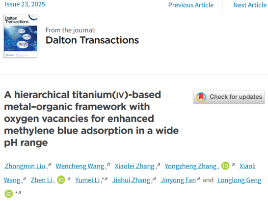 近日,化学化工学院刘中敏博士在有机金属化学领域国际知名期刊Dalton Transactions(影响因子3.3,中科院二区)发表题为“A hierarchical titanium(iv)-based metal-organic framework with oxygen vacancies for enhanced methylene blue adsorption in a wide pH range”的研究论文。论文第一单位为德州学院,刘中敏博士为文章第一作者,耿龙龙教授和李玉美教授为通讯作者。该研究得到了福州大学王文成教授的指导。