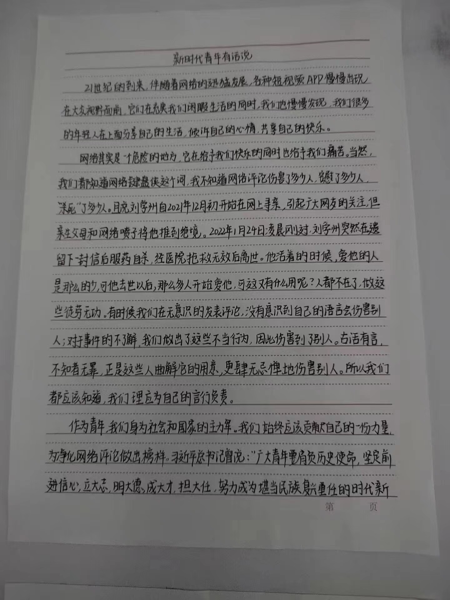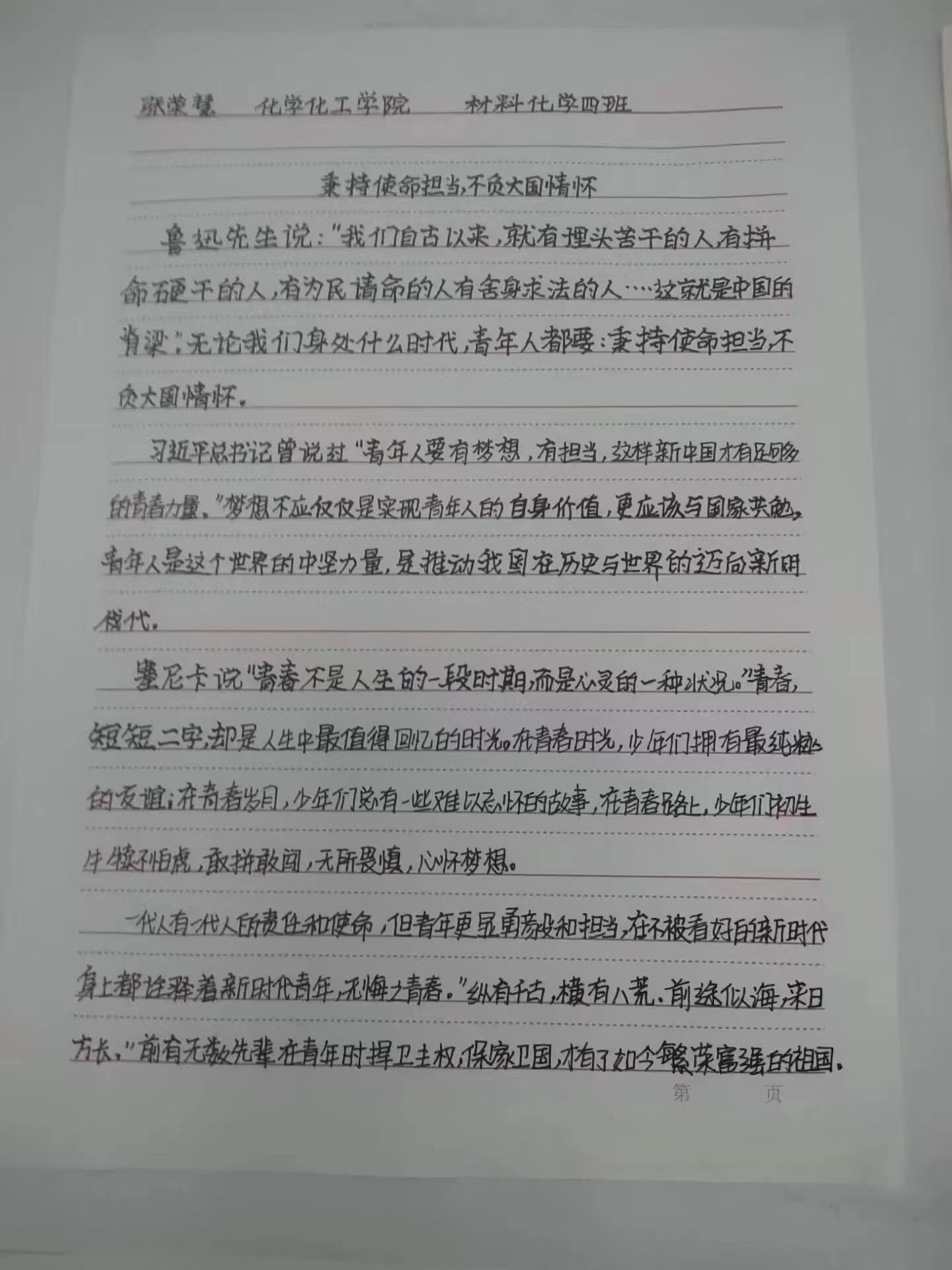 为深入学习贯彻党的二十大精神,引导学生厚植爱党、爱国、爱社会主义的情感,展现学生跟党奋进新征程、青春建功新时代的心声和行动,化学化工学院举办了“青年共话新时代”主题征文活动,呼吁同学们执笔抒怀,通过文字形式展现当代青年的社会担当。