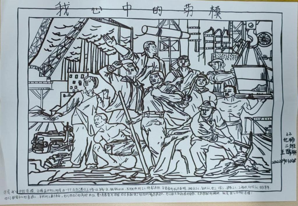 活动中,同学们认真聆听劳动者的感人事迹,深刻把握劳动精神的崭新意蕴与当代价值,以绘画的形式展现当代劳动者的风采与面貌,弘扬新时代劳动精神。以笔传情,以画明志,并以之为榜样。一幅幅精美的宣传画图文并茂、引人注目。