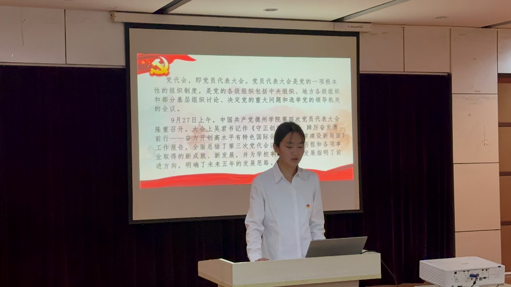 宣讲会上,教师党代表带领党员回顾了第四次党员代表大会,围绕第四次党代会精神,从学校的五年发展思路出发,向学生党员再次强调学校“建设高水平有特色国际化应用型大学”,深入推进“四大战略”,准确把握“九项工程”,努力实现“三个蝶变”,结合学生们关切的问题,深入浅出的解读党代会工作报告。
