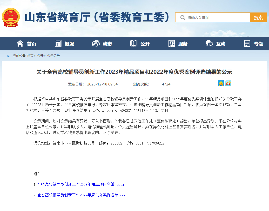 近日,中共山东省委教育工委公布了全省高校辅导员创新工作2022年度优秀案例评选结果。经各高校推荐申报、专家评审等环节,我院辅导员王培培老师的工作案例《从大学生失恋看“心灵咖啡屋”在高校辅导员谈心谈话中的创新应用》入选全省高校辅导员创新工作2022年度优秀案例,荣获三等奖。