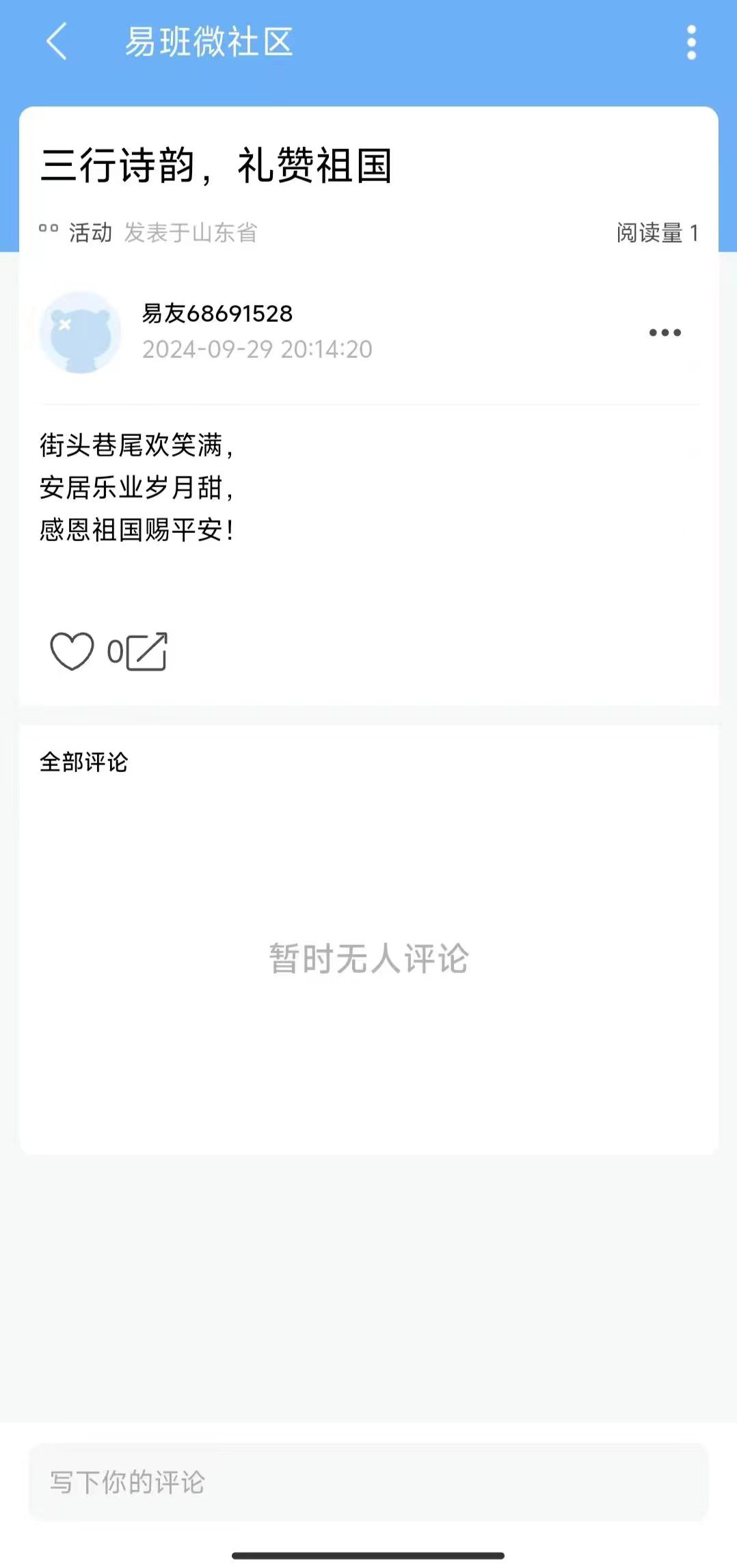 在国庆佳节来临之际,为激发同学们的爱国情怀,表达对祖国的热爱与赞美,10月1日到10月5日化学化工学院举办“三行诗韵,礼赞祖国”线上易班活动。