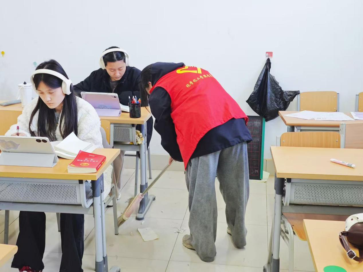 活动期间,志愿者们分工协作、密切配合,按照预先划分的清洁区域,有序开展地面清扫、桌椅整理、窗台除尘等工作,经过细致劳动考研自习区域焕然一新。志愿者们累计清理7间自习室,在活动中用实际行动诠释了"奉献、友爱、互助、进步"的志愿精神,点滴劳动也是对雷锋同志‘螺丝钉精神’的践行。