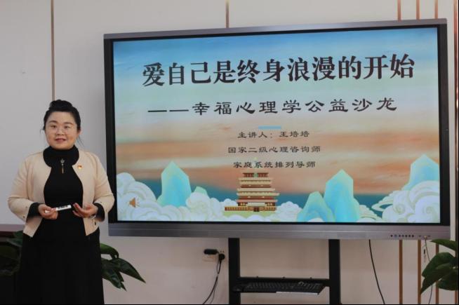 为全面贯彻落实党的二十大精神,用心理学助力我校师生身心健康,3月28日下午,化学化工学院工会成功举办“爱自己是终身浪漫的开始”幸福心理学公益沙龙活动,来自全校35名师生积极参与。本次活动由国家二级心理咨询师、化学化工学院辅导员王培培老师带领,通过体验式互动,引导师生认识自我、表达自我、反思成长、规划未来,以更好的状态投入学校干事创业的热情中来。