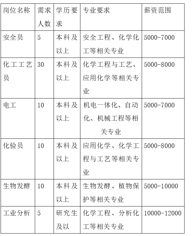 (1)招聘专业:化学、应用化学、化学工程与工艺、材料化学;药学、制药工程、药物制剂;生物工程、生物技术、生物科学等;机械及相关专业;电气及相关专业;制冷及相关专业;安全工程及相关专业等。