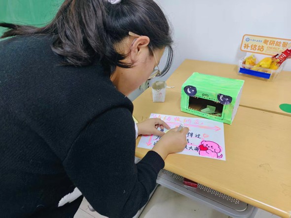 活动围绕“助学减压”目标,制作“情绪宣泄箱”,为考研学生提供负面情绪“疏通口”。学子们将自己的负面情绪和学习压力写到便签上丢进“情绪宣泄箱”,疏解内心压力、交换好运。通过这种方式引导学生察觉自身压力状态及情感反应,精准识别压力来源并学会使用合理方式排遣压力,帮助考研学生跳出情绪内耗黑洞,积极备考,在高强度学习中维持健康心理状态。
