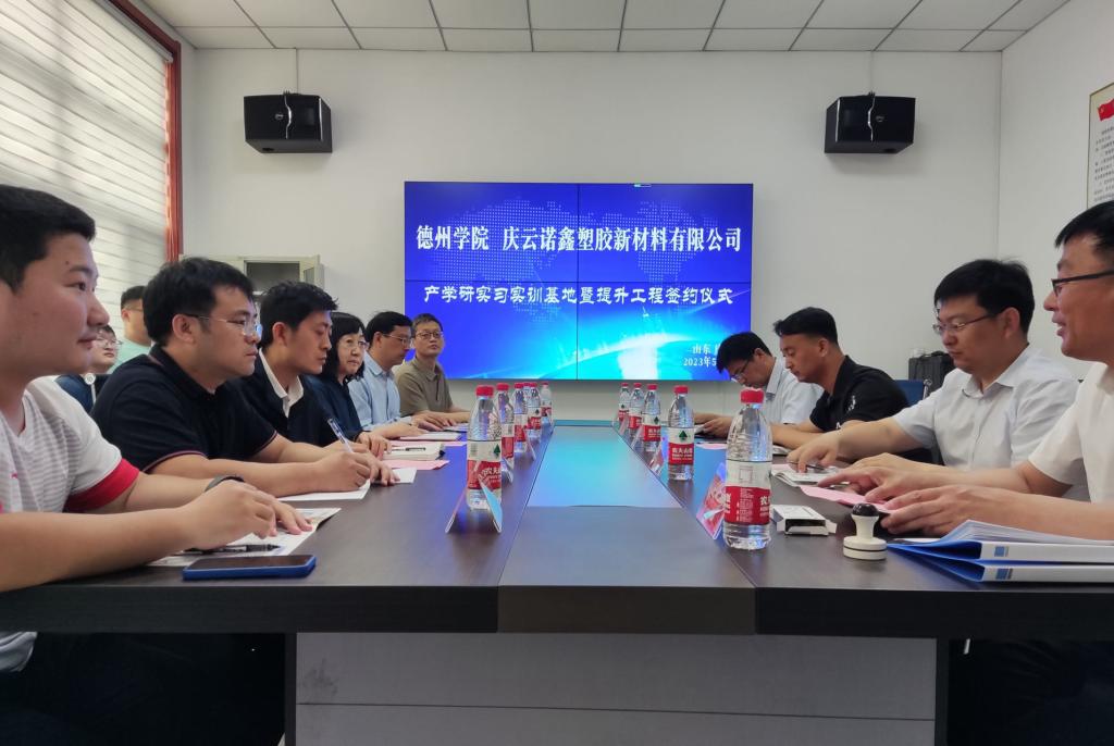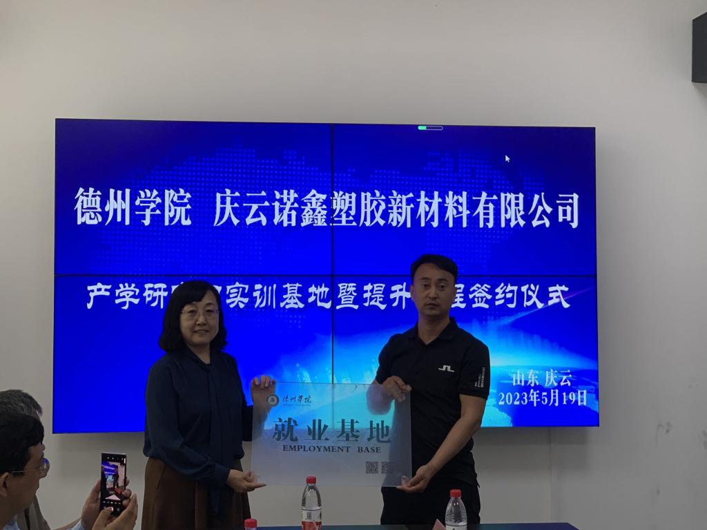 活动中,一行人实地参观了庆云诺鑫塑胶新材料有限公司的生产车间、新厂房建设和产品展区等,公司车间主任为学生讲解公司的主要产品。在座谈交流环节,第三教师党支部教师们分别介绍研究方向,希望通过本次活动,加强同庆云诺鑫塑胶新材料有限公司的技术交流,共同解决产品生产中的技术难题,并希望校企双方以党建为切入口,拓宽毕业生就业创业渠道、培养一批实干人才服务地方企业。公司主要负责人介绍公司的创业历程及相关的产品知识,希望双方不断深化务实合作,通过开展学生实习、毕业实践等一系列活动,加强同化学化工学院的合作。会后,化学化工学院学院与庆云诺鑫塑胶新材料有限公司进行就业实习基地的授牌仪式,并签订《德州学院就业基地共建协议书》。
