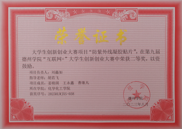 担任实验室助理,协助老师完成科研任务并取得优异成绩。参与“智能驱动化凝胶的设计以及性能研究”课题、“水质净化—多孔麒麟菜凝胶立大功”课题、“防紫外线凝胶贴片”课题的研究,两项校级项目已结项。一项实用型发明专利。荣获第九届德州学院“互联网+”大学生创新创业大赛二等奖。