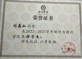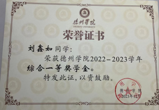 刘鑫如,中共预备党员,2021级环境工程专业学生。连续两学年,学业成绩和综合测成绩位列前茅。曾获德州学院综合奖学金,优秀大学生奖学金和三好学生荣誉称号等。