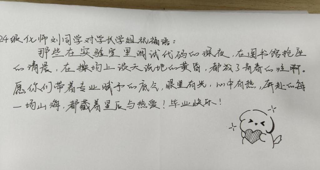 为推进学院心理育人工作,帮助毕业生平稳度过这一重要心理转折点,增进师生、同窗情谊,展望未来。化学化工学院于6月6日至6月8日开展“心影留韶华,笔语寄长风”毕业季主题心理活动,学院学生踊跃参与。