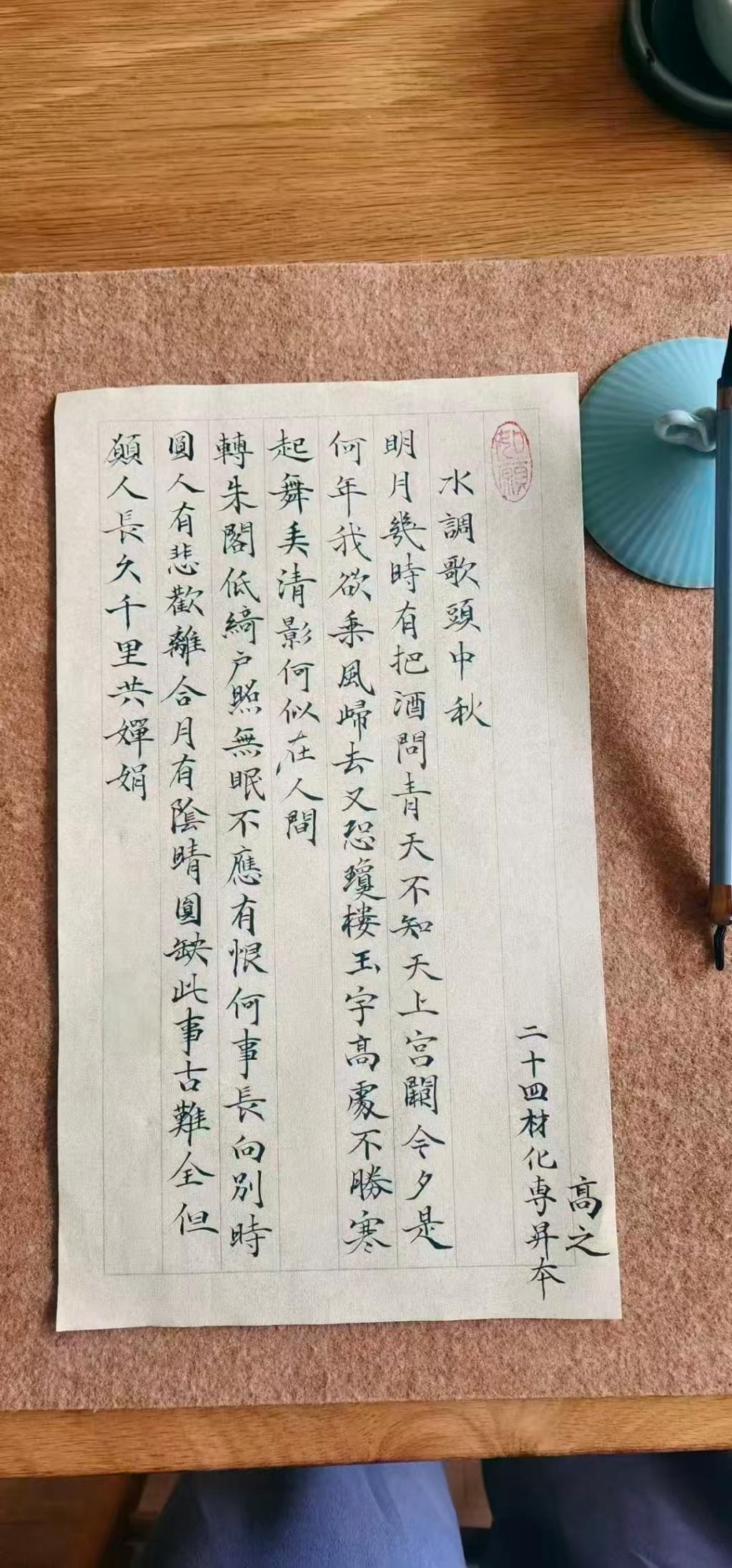 同学们自选中华经典诗文篇目,在中秋佳节的氛围中书写着美好的篇章,字句间满是团圆的温情。一张张作品虽字迹各异,却都承载着美好期许。然后在易班App中分享自己抄写中获得的感想,在笔墨间品味中秋文韵与团圆。