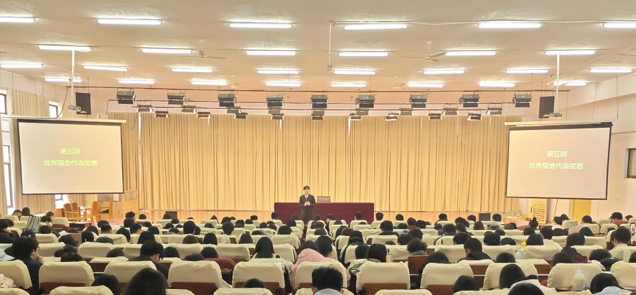 在会议过程中,首先由宿管部负责老师进行开场发言,详细阐述了宿舍中频发的若干问题,主要包括违规电器使用、用电安全事项以及宿舍卫生状况。随后,主持人宣读了文明宿舍获奖名单。接着,辅导员为获奖宿舍的代表颁发了荣誉证书及奖品。此外,会议尾声还特别邀请了优秀宿舍的舍长代表上台,分享了他们在宿舍管理方面的宝贵心得与经验。