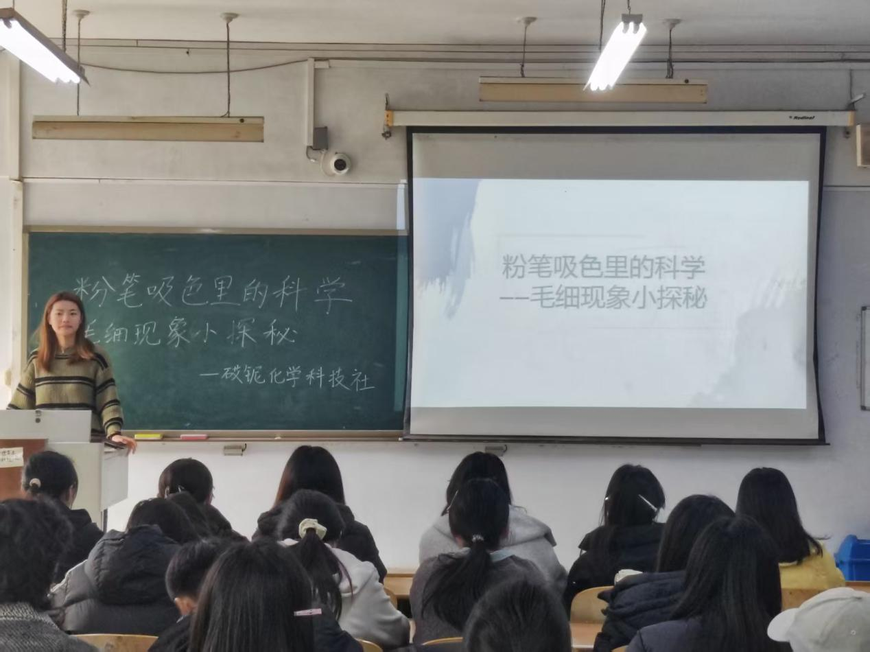 为激发学生对科学探究兴趣,培养创新思维与实践能力,10月25日,化学化工学院在求实楼0207教室举办“粉笔吸色里的科学”特色科普。学院60余名学生参加。