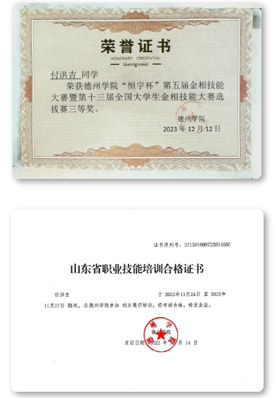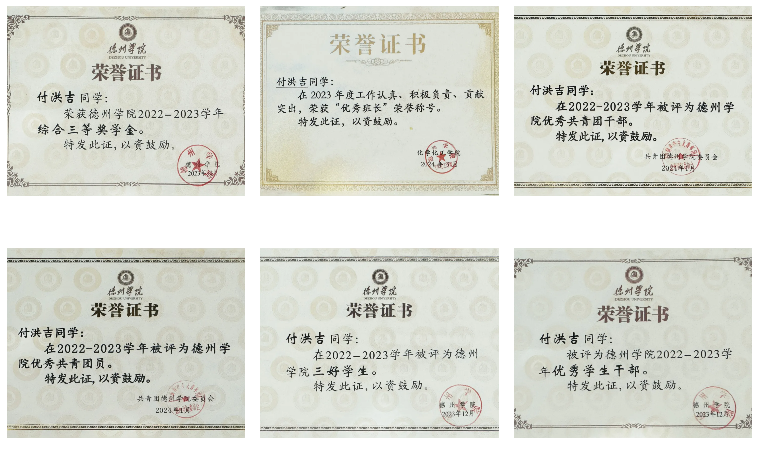 付洪吉始终把学习放在首位,在专业学习过程中,刻苦认真,脚踏实地,成绩优异,2023-2024学年学年学业成绩和综合测评成绩均位列专业前百分之十五,曾获省政府奖学金;对科研工作抱有极大热情,积极参与科研比赛,跟随导师在实验室进行研究,研究方向为无机微纳米功能材料的控制合成,曾获 “第十七届全国大学生节能减排社会实践与科技竞赛”校级一等奖、德州学院“恒宇杯”第五届金相技能大赛校级三等奖、第十八届“挑战杯”德州学院大学生课外学术科技作品竞赛三等奖等奖项。