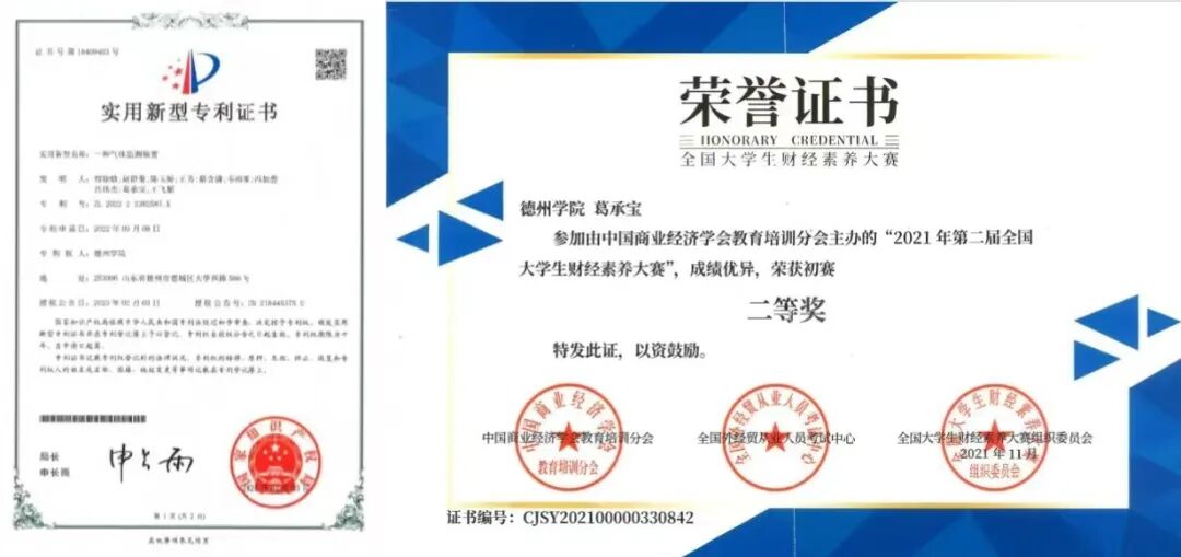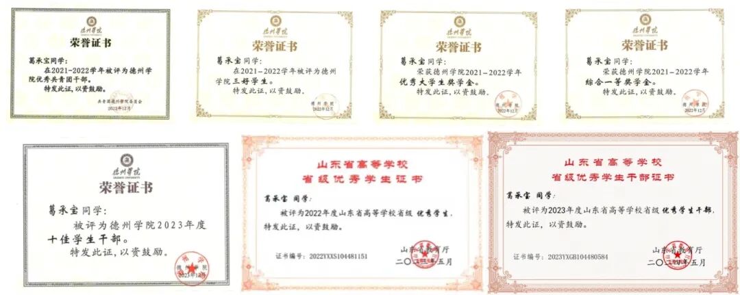 连续两学年学业成绩与综测成绩均位列专业第一名。曾获“2021-2022”学年国家奖学金、“2022-2023”学年国家奖学金、“2023-2024”学年国家奖学金、山东省优秀学生干部、山东省优秀学生、德州学院优秀大学生奖学金、综合一等奖学金、综合二等奖学金、十佳大学生、十佳学生干部、优秀学生干部、优秀共青团干部、三好学生等荣誉。