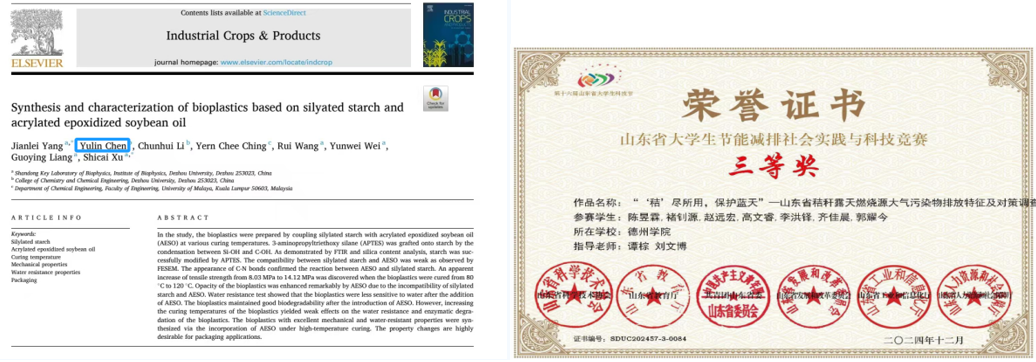 作为大学生创新创业训练项目负责人,她牵头开展“NaOH对硅烷改性淀粉-环氧大豆油基生物塑料调控机理研究”,成功拿下省级立项。截至目前,已发表SCI论文1篇,斩获软件著作权1项、专利1项,用科研成果诠释青春担当。
